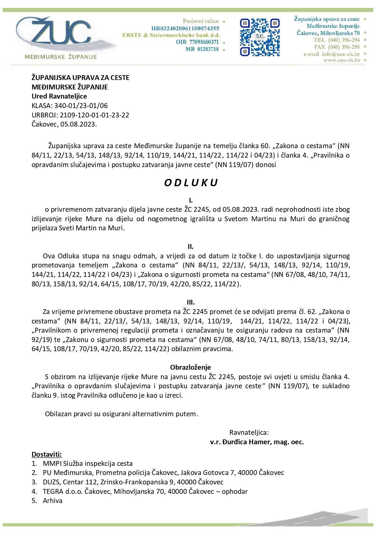 Obavijest o privremenom zatvaranju javne ceste ŽC 2245